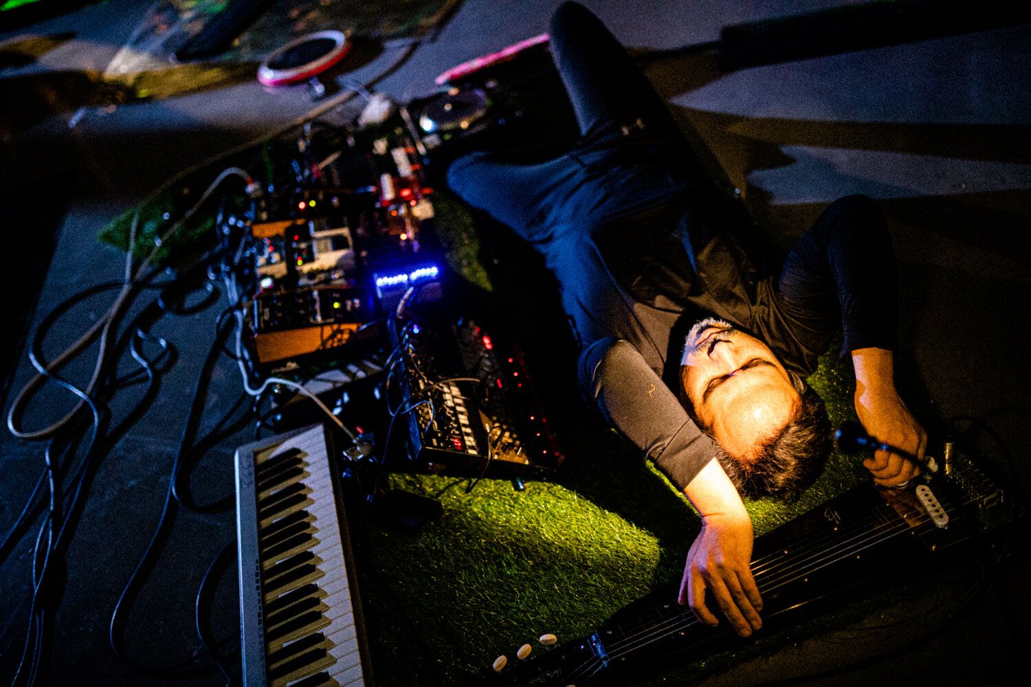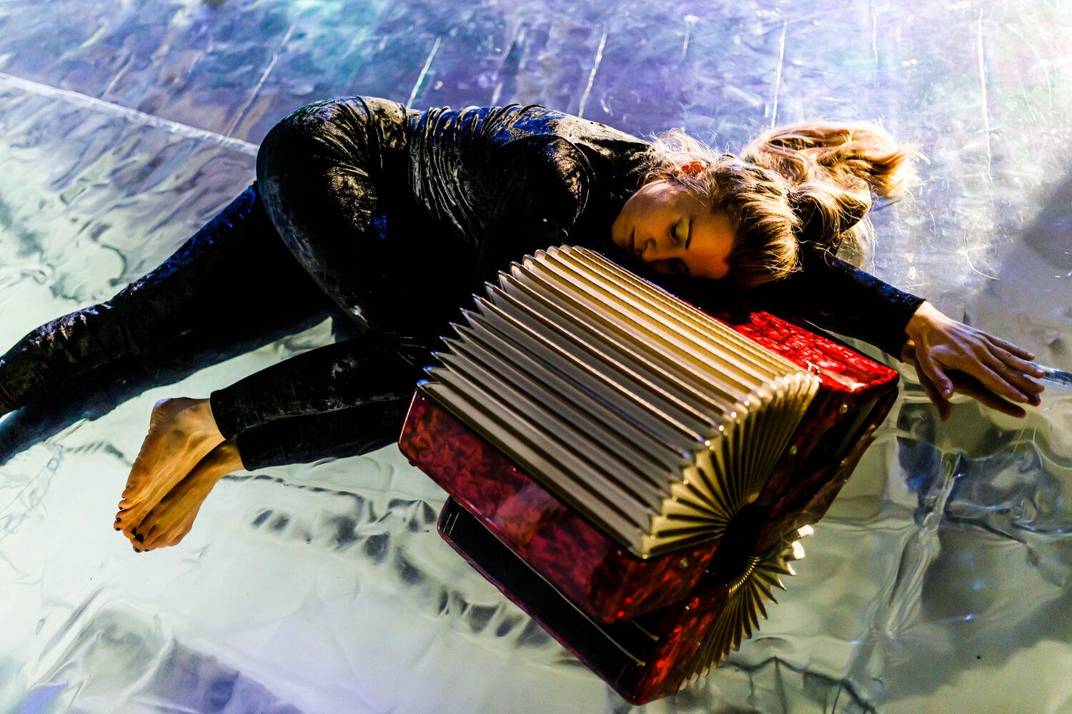 In ›Land of the Flats‹ bewohnen die Performer*innen die Grenzen zwischen den Medien. Dort setzen sie Gesetzmäßigkeiten außer Kraft und kreieren eine Welt aus eigenartigen Spielweisen und Verwandtschaften. Nicht um der realen Welt zu entfliehen, sondern um ihr Tun aus einer anderen Perspektive zu erfahren. Sie nehmen sich die Sicht, um das Sehen zu ertasten. Sie erzüngeln Silben, die sich zu neuen Wörtern verbünden. Sie formen die Welt, die sie formt und werden zu Klaviermenschen, Menschgitarren und Vibrafonwesen. Sie verschmelzen zu Landschaften aus Lunge, Flügel, Becken, Boden und Schlegel. Ihre jeweilige künstlerische Disziplin wird zu einem offenen Gefüge mit Poren und Fühlern, durchdringbar und mehrdeutig in dem, was sie suchen.